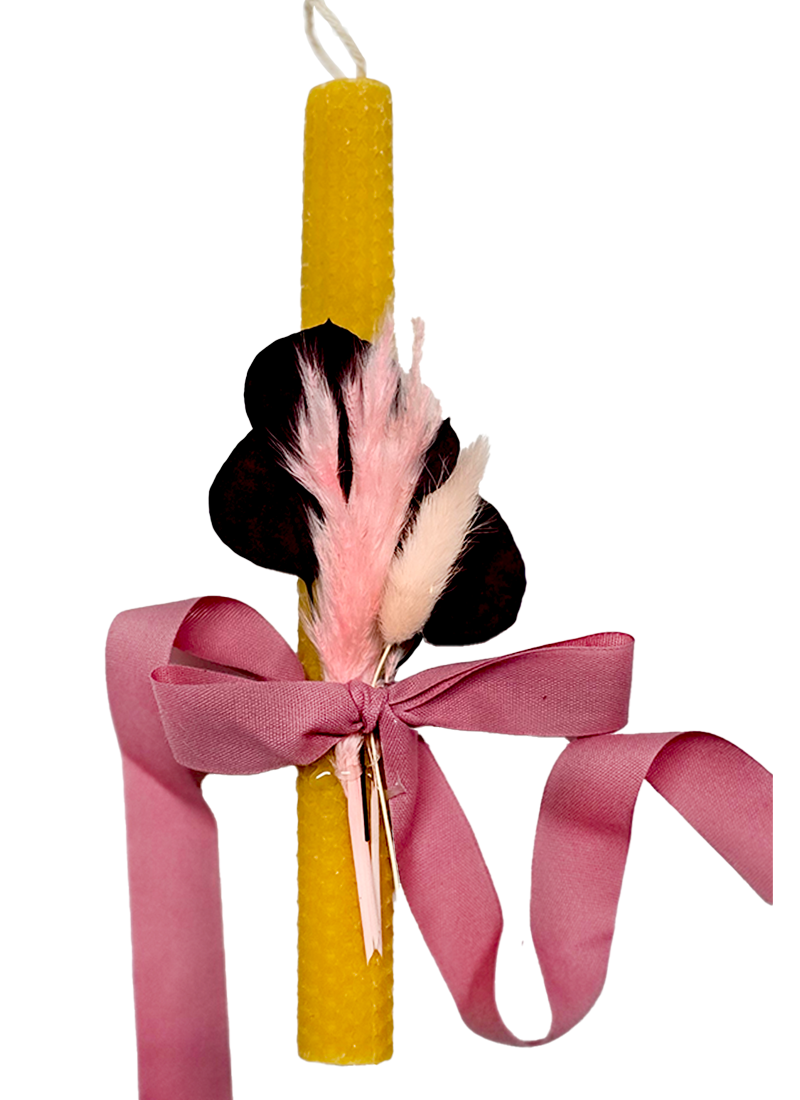 Λαμπάδα 25 εκ. από 100% φυσικό μελισσοκέρι, διακοσμημένη με αποξηραμένα λουλούδια και βαμβακερή κορδέλα.